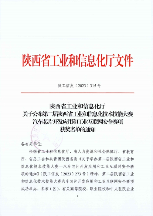 近日,由陕西省工业和信息化厅、陕西省人力资源和社会保障厅、陕西省教育厅、陕西省总工会、共青团陕西省委主办的陕西省工业和信息化技术技能大赛成绩公布。