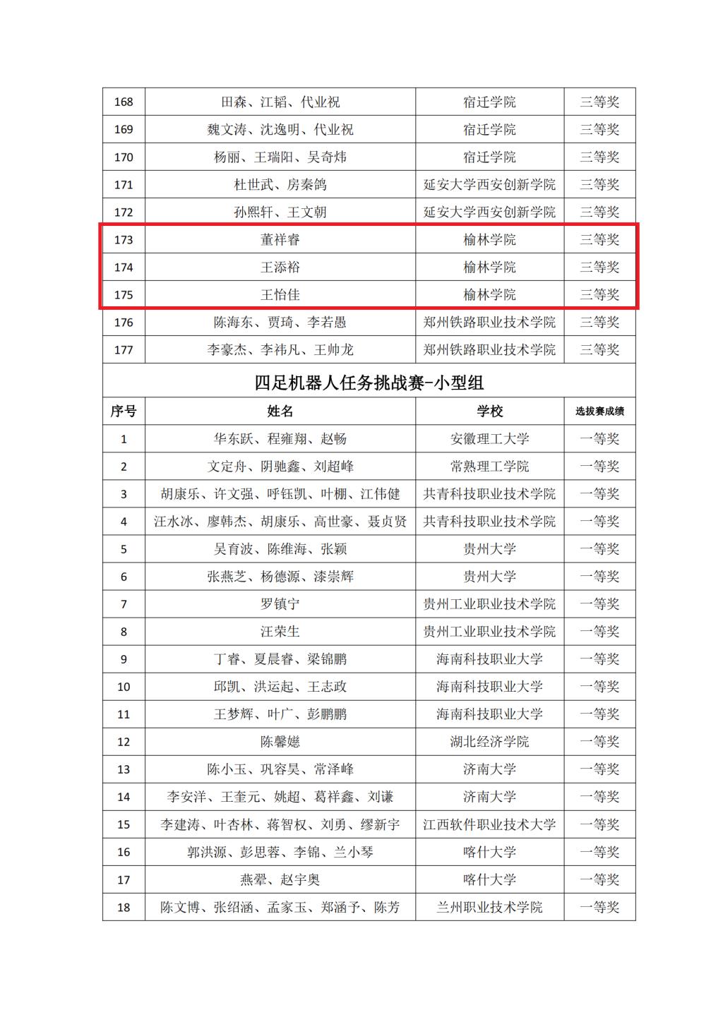 由365英国上市官网张峰、冯治东、田建学等多位教师指导参赛的9支队伍成功进入榜单,分别获得中国赛区选拔赛四足机器人任务挑战赛-中型组、四足机器人任务挑战赛-小型组两个赛项的一等奖2项、二等奖5项、三等奖3。总决赛将于20231127~30日在杭州职业技术学院举办。