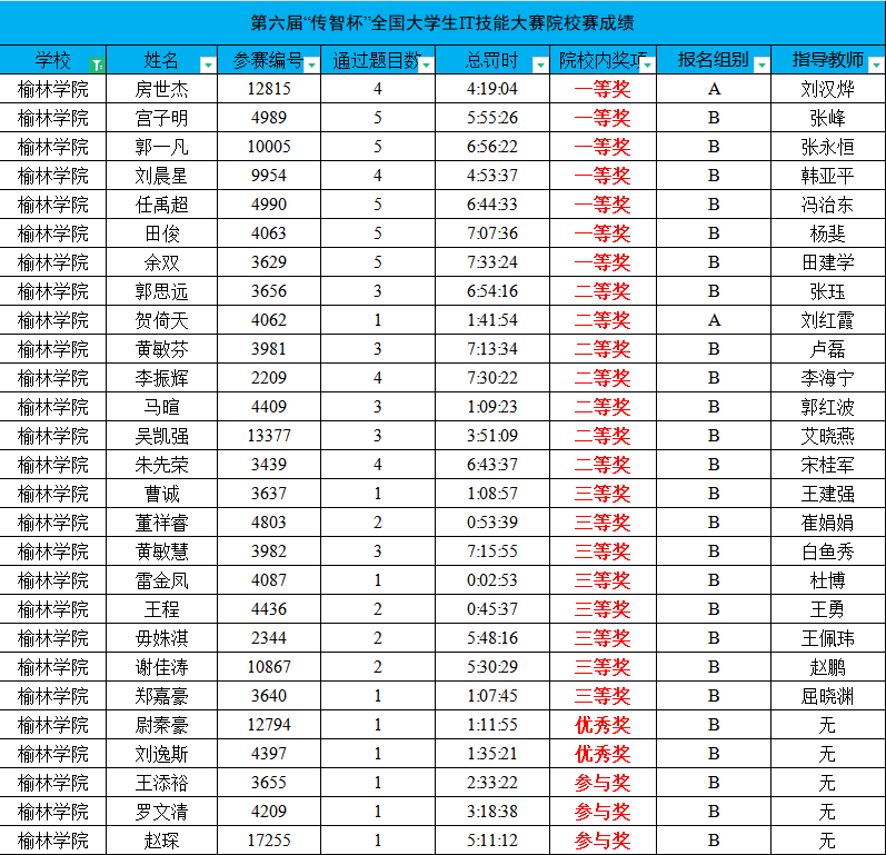 我校共有56名参加了程序设计挑战赛各赛道的比赛,最终22名同学从10552名参赛选手中脱颖而出,其中两名同学获得A组一等奖和二等奖,其余20人获得B组参与奖以上的奖励,在同类院校中名列前茅。(说明:985、211本科生及研究生只能报A组;其它院校本科生可自行选择报A组或B组).