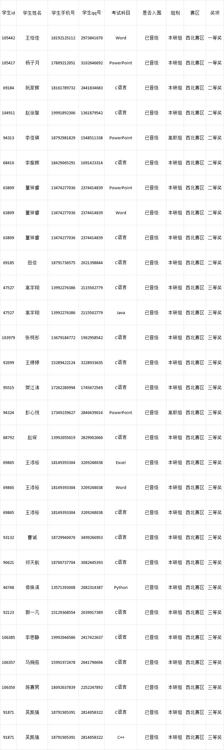 2023年12月5日18:00时,由全国高等学校计算机教育研究会主办的第五届全国高校计算机能力挑战赛区域赛(省赛)成绩公布,我校共获得区域赛奖项29项,其中一等奖2项,二等奖8项,三等奖19项。详见下表: