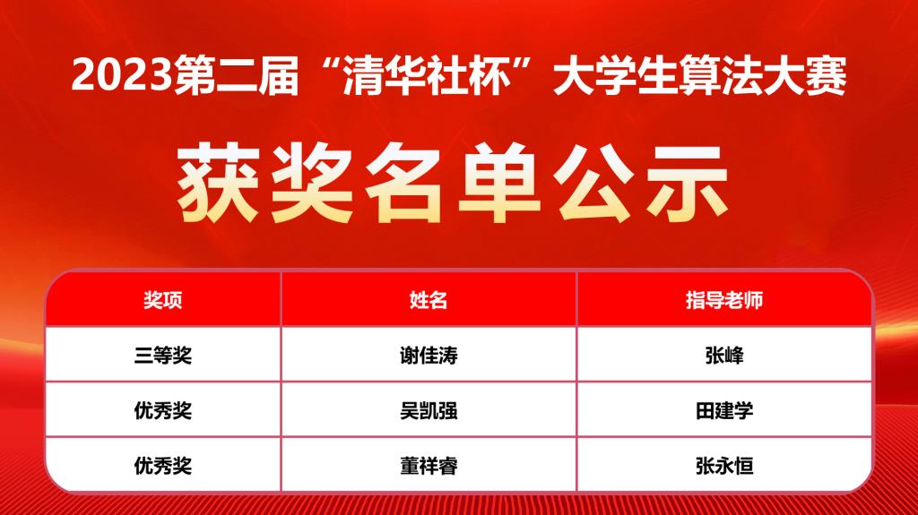 2023第二届“清华社杯”大学生算法大赛成绩出炉。本届大赛参赛人数破万,协办院校突破200所,我校学子与清华大学、浙江大学、北京理工大学等高校同学同台竞技,探索最优解题算法,沉着解题,最终取得佳绩!