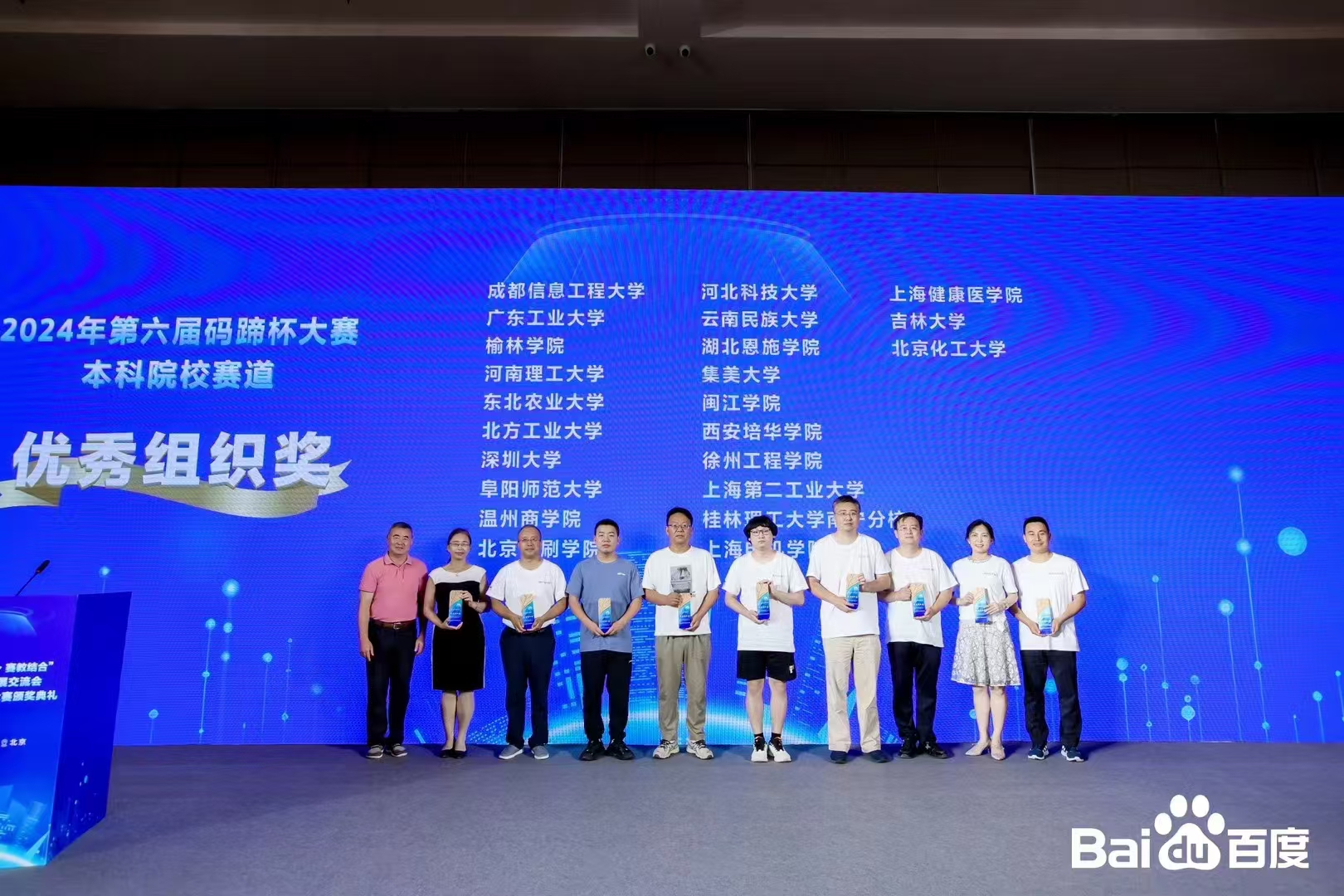 8月17日,颁奖礼于九华山庄举行,清华大学出版社和百度公司做为支持单位出席活动,全国高等学校计算机教育研究会研究会荣誉理事长、码蹄杯大赛荣誉主任、武汉大学何炎祥教授,清华大学出版社卢先和副社长,百度公司高校合作部李轩涯总监分别致辞。百度高校合作部副总监计湘婷做了人工智能人才培养的主题报告;中国计量大学的赵春鱼教授做了《基于计算机类竞赛的高校创新人才培养画像探索》的特邀报告;多位院校专家及带队教练对学校的人才培养模式,以赛促教、赛教结合的训练方法,进行了深度分享;码蹄杯专家组组长,吉林大学黄岚教授对今年的比赛做出了全面总结。颁奖环节,刘汉烨教授代表我校领取优秀组织奖。