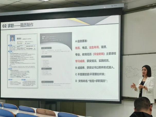 最后,王二霞向同学们讲授了简历的制作、投递、跟踪、面试技巧。她强调,简历的内容要真实丰富,将自己的课程学习成绩、获奖情况、实践经历放到简历里面,并多次投递,以提高投递成功的概率。同时,要关注各大国有企业的官方网站,企业的官方公众号,政府媒体等,抓住机会,多尝试。现场投递时,要制作有针对性的简历,并在现场围绕企业的需求简要说出自己的特长与特点。投递简历后,要时刻跟踪关注简历动向,并且要勇于询问企业自己的招聘进度,展现勇气与执着。在面试环节中,要表现好的情绪管控,在保持真诚的前提下全方位展示自己的优点。