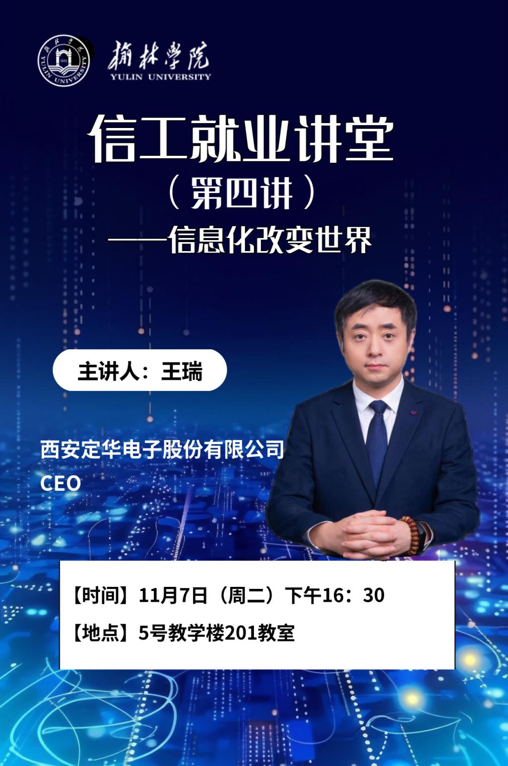 为帮助同学们认清当前就业形势,了解自己的专业优势从而更好地规划自己的未来,尽早确立就业方向。365英国上市官网组织大一、大二、大三同学参加“信工就业讲堂”第四讲,本次邀请到西安定华电子股份有限公司CEO王瑞为同学们带来题为《信息化改变世界》的报告。