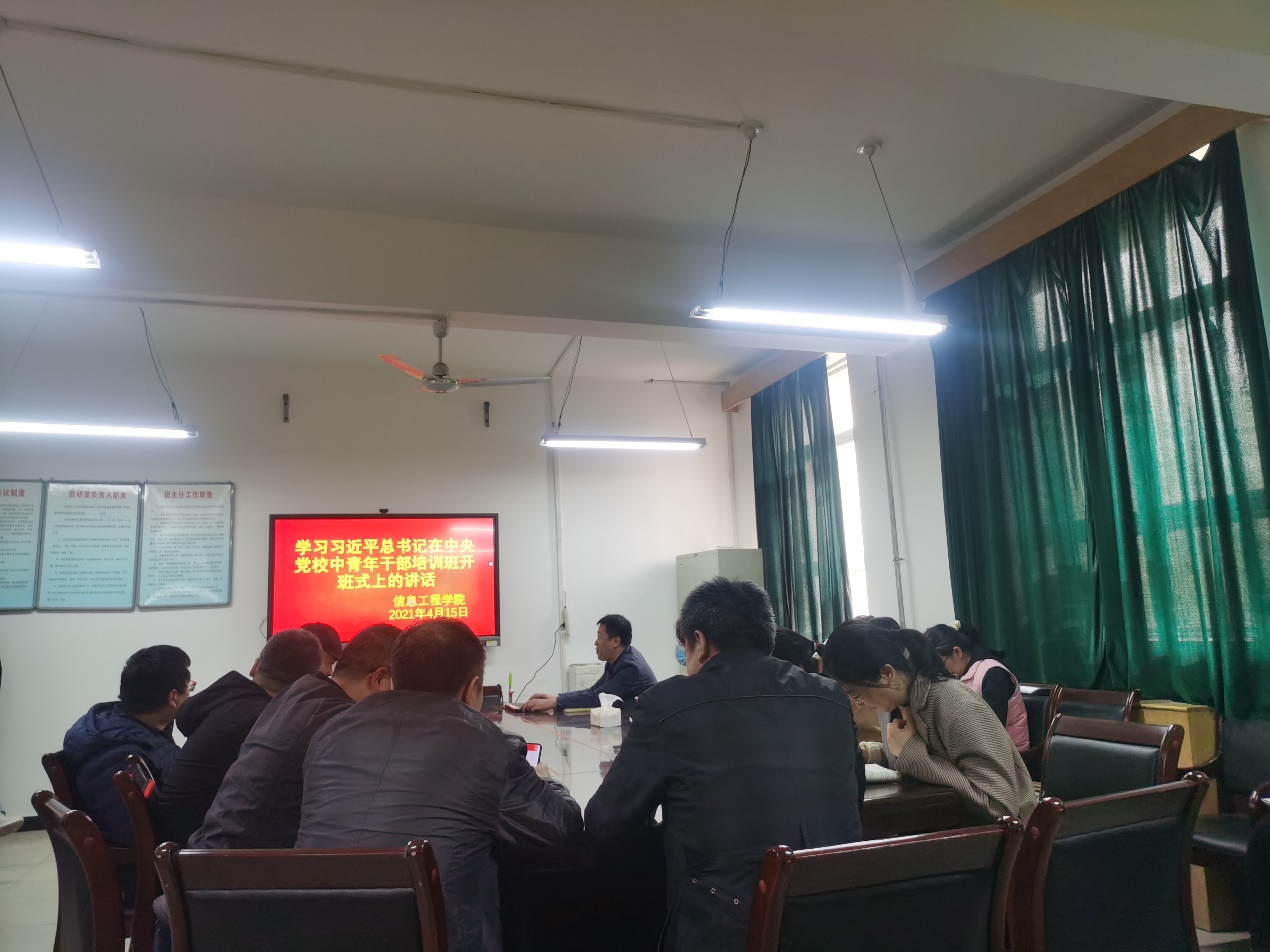 会议首先由信息工程学院党总支副书记宋珍领学习近平总书记在中央党校(国家行政学院)中青年干部培训班开班式上发表的重要讲话。随后,李红卫强调,全院所有中青年教师要按照有关要求,认真学习习近平总书记在中央党校(国家行政学院)中青年干部培训班开班式上发表的重要讲话,并结合自身特点,进行各种形式的学习交流,进一步强化理论武装,推动青年干部提高解决实际问题的能力。