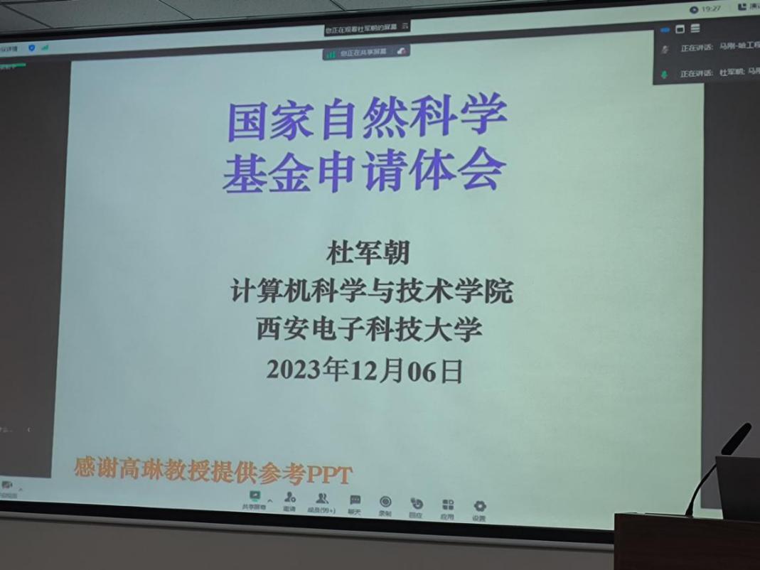 为进一步提升365英国上市官网教师国家自然科学基金项目申报书的撰写质量,提高申报成功率,12月6日晚上,我院特邀西安电子科技大学二级教授、国家级人才、博导杜军朝教授在1号楼210会议室做了题为“国家自然科学基金项目申请体会”的专题辅导报告,学院拟申报自然科学基金的中青年教师、博士及2023级研究生40余人参加了报告会。
