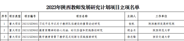 近日,陕西教师发展研究院对2023年度陕西教师发展研究计划项目拟立项项目进行了公示,拟确定教师发展研究计划项目98项,其中重点项目29项、一般项目39项、青年项目30项。我院吴敏宁教授申报的“人工智能助推地方高校教师发展路径研究”成功获批青年项目1项,也是我校唯一获批的计划项目。青年项目鼓励具有一定研究潜力的青年学者和一线教师申报,促进青年人才快速成长,培养一批优秀学术骨干。