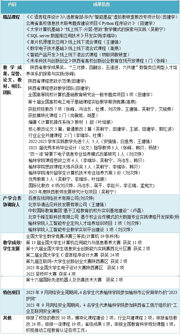 教育教学创佳绩,立德树人书新篇,优秀毕业论文指导老师3名、思政大练兵获奖3项、优秀教案3人,参加陕西省思政大练兵1人并荣获课程思政“教学能手”。对接学校十四五规划,实施“一人一课一精品”工程,打造高质量的课程、教改、专业和教学成果。持续实施“教授+辅导员”的协同育人模式工程,提高学生学风建设,提升学生学业、考研和就业质量。持续推进“计算机科学与技术”、“物联网工程”专业工程教育认证各项工作,以工程教育认证提升学院办学水平。培育人工智能、数字经济领域现代产业学院,以加强现代产业学院建设为抓手,深化产教融合。打破学科专业壁垒,培育特色优势专业集群,推进“智能+”与新农科、新文科跨界融合发展。培育2-3个校级教学团队、1个省级教学团队。打造卓越人才培养班,顺应企业对云管理、大数据、人工智能等领域的人才需求。