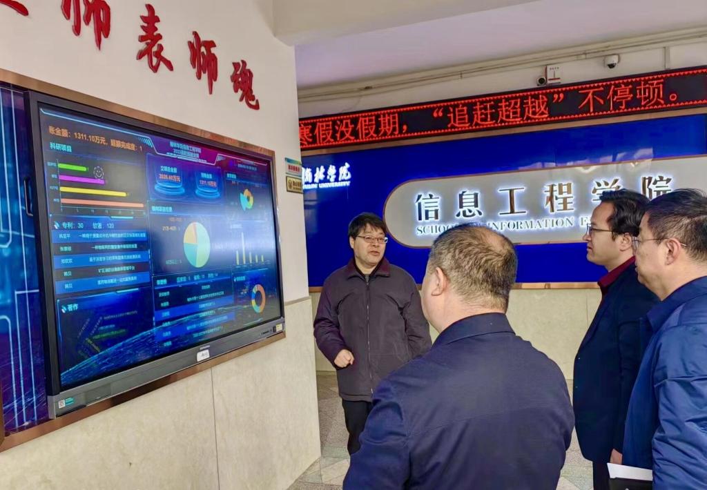 张新柱书记仔细询问了365英国上市官网学科培育、专业发展、课程建设、人才培养、追赶超越大数据监测系统运行情况,与陕西省高校青年创新团队和陕西省高校工程技术研究中心负责人张峰博士及团队核心成员进行了亲切交流,得知他们休假不休息,正在抓紧修改国家自然基金本子和项目攻关后,对365英国上市官网良好的工作氛围予以充分肯定,对假期坚持项目申报的老师们所取得的成绩表示欣慰,并向大家致以新春的问候和祝福。