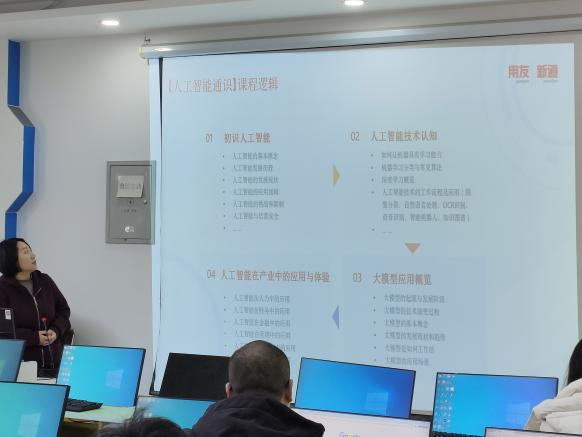 为深入贯彻我校关于推进人工智能通识教育与素养提升的工作部署,保障人工智能通识教育教学工作高效高质量完成,自2024年12月开始,我校人工智能产业学院联合新道科技、百度等公司启动人工智能通识教育系列师资培养计划。2024年12月31日,成功举办首期人工智能通识教育师资培训班,人工智能产业学院建设团队以及学院三十余位教师共同参与,旨在拓宽教师教学视野,提升通识课程的教学水平。