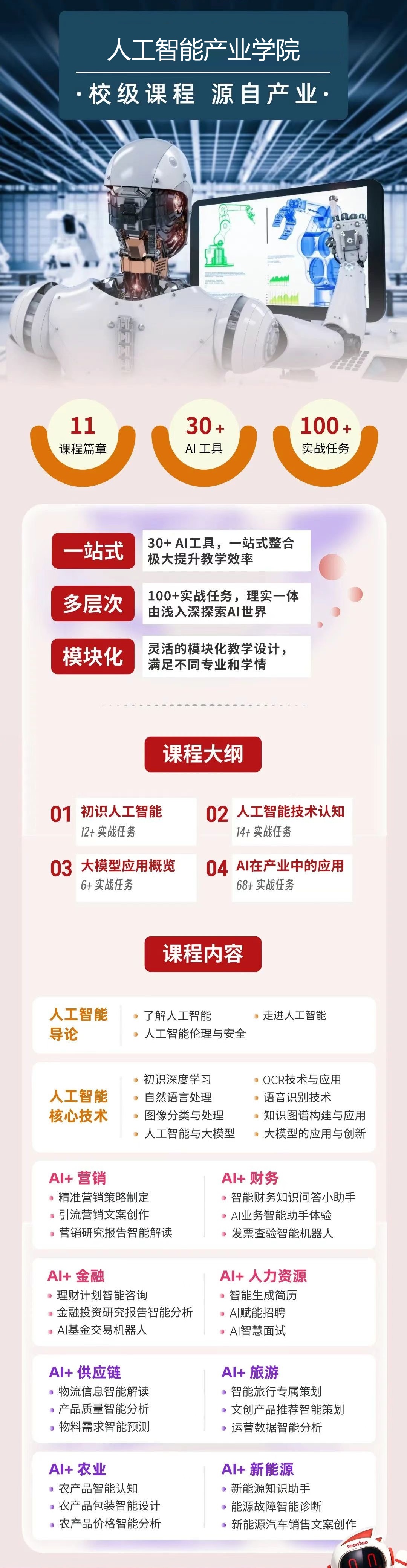 为进一步深化本科教育数字化转型,探索人工智能通识教育新路径,我校在新版本科人才培养方案中,把人工智能通识课程纳入全校公选课,这是适应时代需求发展、培养创新型人才的关键一环,该课程结合不同专业人才培养需求,自2025年起,面向理工、文史、管理、艺术类48个专业开设,由我院人工智能产业学院组建教学团队,团队成员由人工智能领域专业教师组成,将为学生打造全新的学习场景和自主学习空间,探索形成个性化学生路径,不断推动我校人才培养数智化转型提升。为保障人工智能通识教育教学工作高效高质量完成,自2024年12月开始,我校人工智能产业学院联合新道科技、百度等公司启动人工智能通识教育系列师资培养计划。