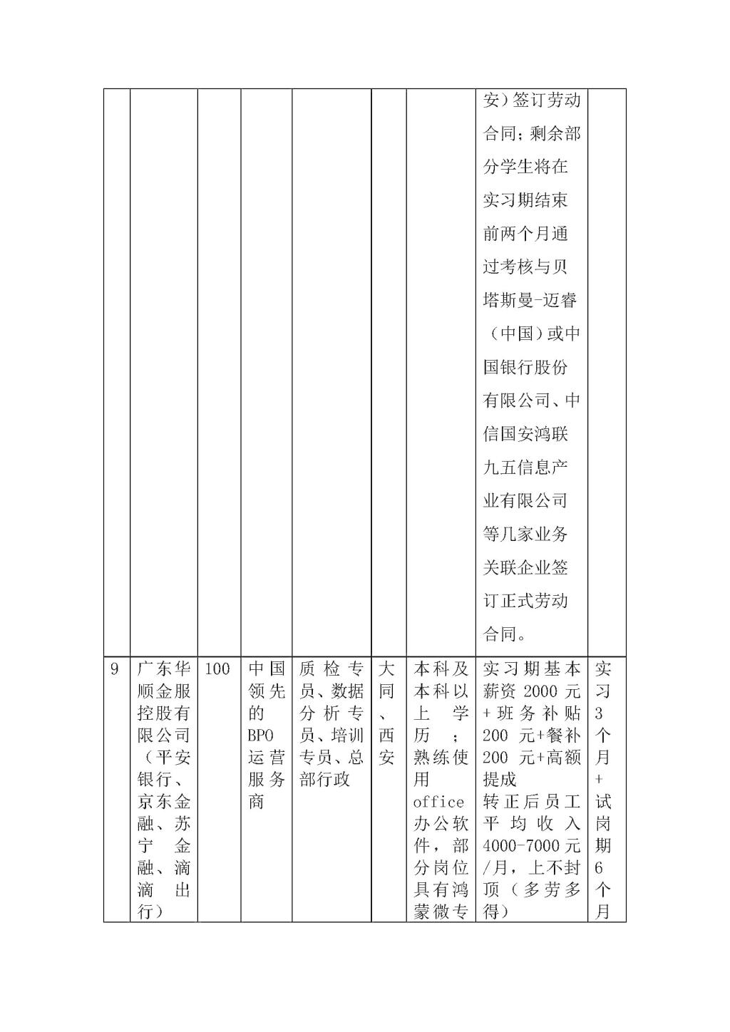 9、广东华顺金服控股有限公司大同分公司是大同市政府重点招商引资项目,目前共建设4个职场:一期职场位于大同金贸国际中心云中声谷大数据智慧服务,基地,交通便利,距大同南站8分钟车程,距云冈机场15分钟车程,设置工位1200席。二期职场位于平城区汇泉广场,设置工位200席,同时正在规划中11层、13层共600席。三期项目规划位于城北东风里,大同市政府投资打造的数字经济产业园,总规划占地4万平米,共计5层,公司位于园区综合条件最优的5层职场,该层建筑面积3000平米,改造交付后可容纳500个物理坐席。四期职场位于城西文创园煤气罐,设计规划储气罐内部按五层设计改造成为云中声谷大数据智慧服务中心,改造后建筑面积可达到9000平米,预计提供1200个物理坐席。