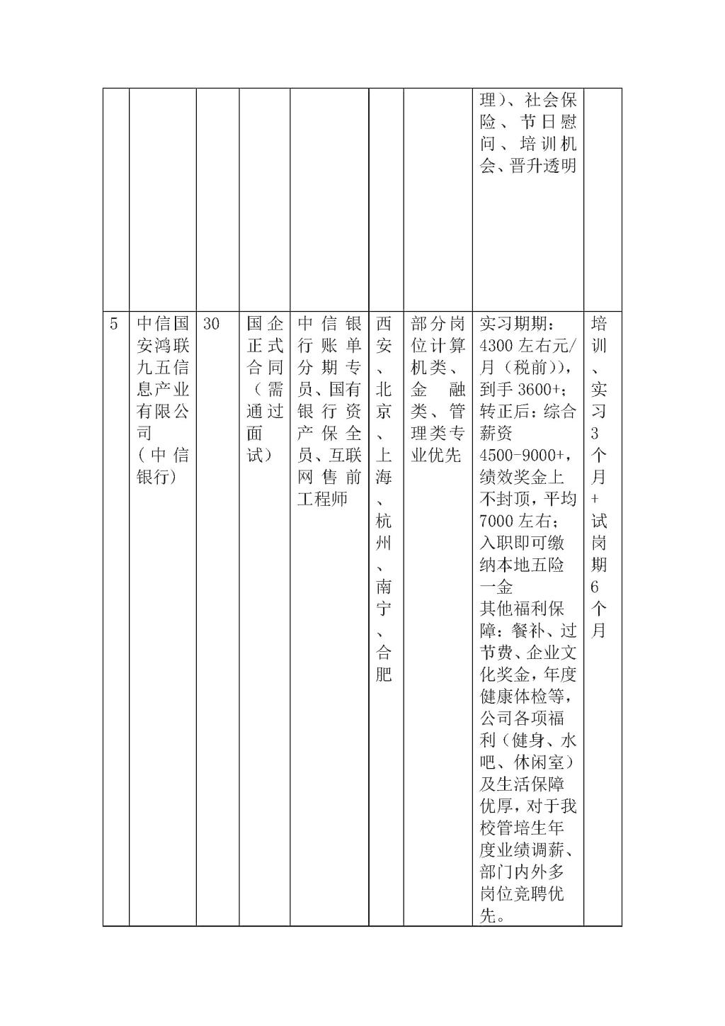 5、中信国安鸿联九五信息产业有限公司(中信银行)成立于 1995 年,1997 年获得高新技术企业认证,鸿联九五前身为邮电国际旅行社信息网管理中心,是邮电部所属邮电国旅集团,2001 年正式划拨中信集团。现由中信国安信息产业股份有限公司控股,总资产达15.5 亿元。鸿联九五在全国范围内拥有 80 多家分子公司,服务网络遍布全国。通讯网络遍布全国90%的省市和自治区,在全国30多个城市部署九大交付中心基地,统管十大业务中心,是一家专业的企业综合信息服务解决方案提供商。(本次实习在安徽合肥,实习期满后回西安分公司或通过考核进入中信银行)